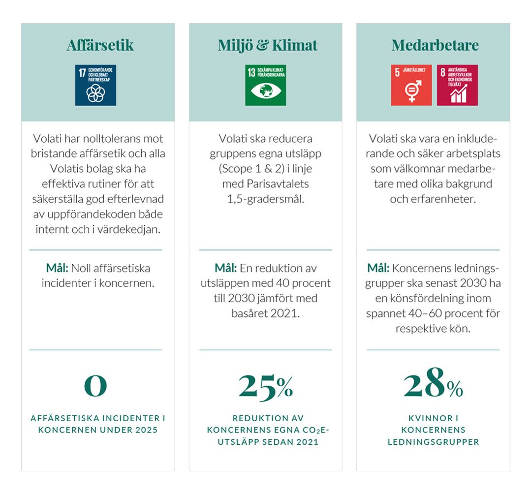 Volatis hållbarhetsarbete baseras på de tre koncerngemensamma fokusområden: